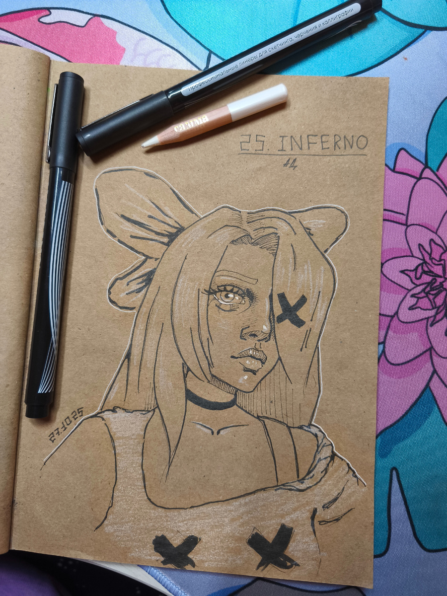 Как нарисовать ад? Что вообще стоит изображать на такую тему? Идей было ноль, но вот ко мне пришло озарение. Есть мультсериал "Отель Хазбин", действие которого происходит как раз в аду. Главная героиня (дочь Люцифера) открывает отель, где жители ада могут попытаться перевоспитаться и получить шанс попасть в рай. И я подумала: а нарисую ка я персонажа из этого мульта! Мой выбор пал на Вэгги. Не буду раскрывать, кто она такая, это все таки интрига) Нарисовала ее в своем стиле, а не в стиле мульта. Кстати, тут скоро выйдет второй сезон "Отеля Хазбин". Я прямо очень жду его выход)