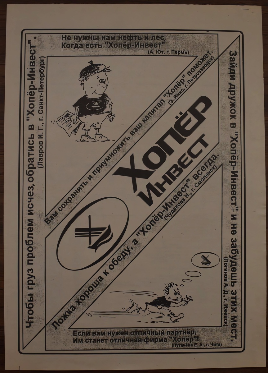 В одной волгоградской квартире в 90-х нашли мешки с наличкой. Инкассаторские. Настоящие. Там же, где ещё недавно принимали людей в офисе инвестиционной компании, обещая стабильный доход, проценты, надёжность и прочую обёртку. Это были остатки одного из самых громких разводов десятилетия - финансовой пирамиды, которая называлась «Хопёр Инвест». Всё началось с ларьков. И закончилось тюрьмой, побегом и онкологией Старт - 1992 год. Формально - сеть овощных точек. Не формально - будущий канал по перекачиванию денег от наивных граждан к предприимчивым дельцам. Компания официально регистрируется, создаётся аж три разных юрлица с похожими названиями. Людям выдаются какие-то сертификаты - бумажки с видом на миллионы. Кто понимал, что происходит? Да никто особо. Главное - по телевизору показывали, рекламировали с участием певцов и бывших КГБшников. Основатель – пацан после армии, мама – преподаватель физкультуры, друг – слесарь На бумаге учредителей было четверо. Лев Константинов - тот самый,
