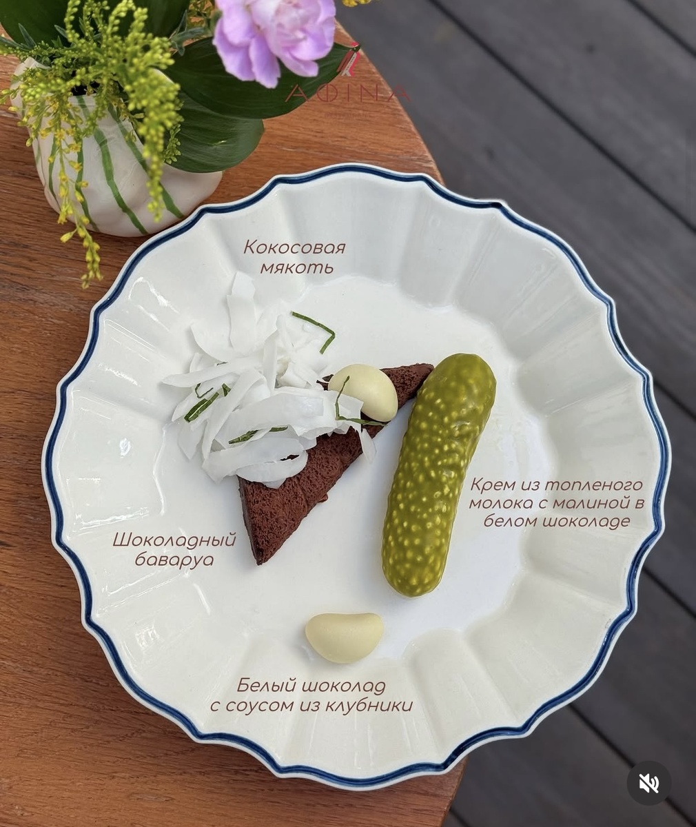 Обед в Афине уже приятный ритуал, из-за удобства расположения и вкусной понятной кухни забегаем туда частенько, и ощущение, что все меню, как будто бы попробовали. Но всегда находится то блюдо, ради которого идем туда снова! Намедни увидела в аккаунте ресторана невероятно аппетитную тарелочку с соленным огурчиком, чесночком и кусочком бородинского хлеба. Начала читать подпись и, оказалось, это десерт! Цена десерта 990₽ Да, понятно, что фантазийные десерты в виде овощей, фруктов и совсем не сладких блюд, мы уже видели и пробовали много раз. Но все равно, каждый раз, видя такую историю, не перестаю удивляться виртуозному и очень реалистичному исполнению! Подача впечатляющая: приносят большую банку с как бы замаринованными огурцами и официант достает оттуда огурчик и кладет на тарелку с «хлебом», «луком» и «чесноком». Тут, кстати, еще и вкус десерта оч удачный вышел. Тонкая шоколадная оболочка огурчика, а внутри крем из топленого молока с малиной, и белый шоколад с соусом из клубники в