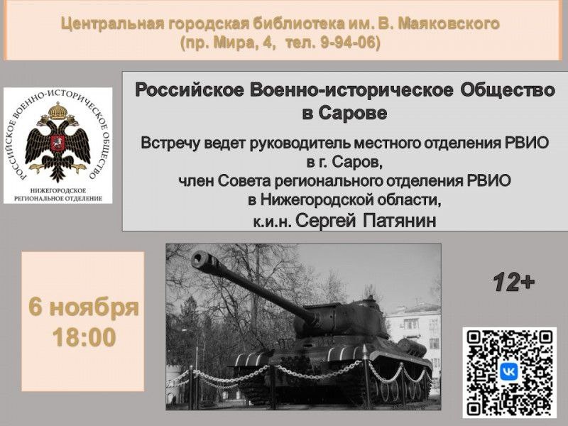 #Маяковка_приглашает #Афиша 🔥 6 ноября в 18:00 в Маяковке пройдет встреча с активом местного отделения Российского Военно-Исторического Общества в Сарове. Вести встречу будет руководитель местного отделения, член Совета регионального отделения РВИО в Нижегородской области, кандидат исторических наук Сергей Патянин. В 2012 г. по указу президента России №1710 в нашей стране появилась общероссийская общественно-государственная организация «Российское военно-историческое общество», сокращенно РВИО. Его отделения есть во всех 89 регионах нашей страны. На встрече вы узнаете об истории Российского Военно-Исторического Общества, его деятельности, основных проектах и мероприятиях, ключевых направлениях работы Регионального отделения РВИО в Нижегородской области, а также сможете принять участие в обсуждении перспектив работы местного отделения в Сарове. Сохранение исторической памяти зависит от каждого из нас!