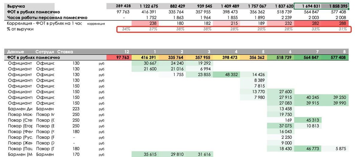 🤔 Почему я всегда говорю, что нужно развивать насмотренность? 🔍 Да потому что, когда у тебя есть насмотренность, ты можешь, зная просто абсолютные значения в цифрах (читай: проценты), сделать выводы: — насколько адекватны те или иные расходы компании по отношению к выручке — насколько эффективно компания работает — насколько быстро бизнес растет или насколько сильно стагнирует в периоды кризиса или несезона ✨ На скрине вы видите расчет Labor Cost, то есть коэффициента отношения затрат на заработную плату персонала к выручке компании. Если вы этот коэффициент не знаете, то, соответственно, проанализировать не сможете. 📌 Но мы-то знаем, что золотая середина — это 30%. А если Labor Cost меньше 30%, значит, скорее всего, продают много алкоголя. ↗️ Посмотрев на этот скриншот, мы видим, как после открытия Labor Cost начинает падать, то есть компания уже закончила проработки, отработала калькуляционные карты, оптимизировала бизнес-процессы, и цифры себестоимости выходят к плановым зна
