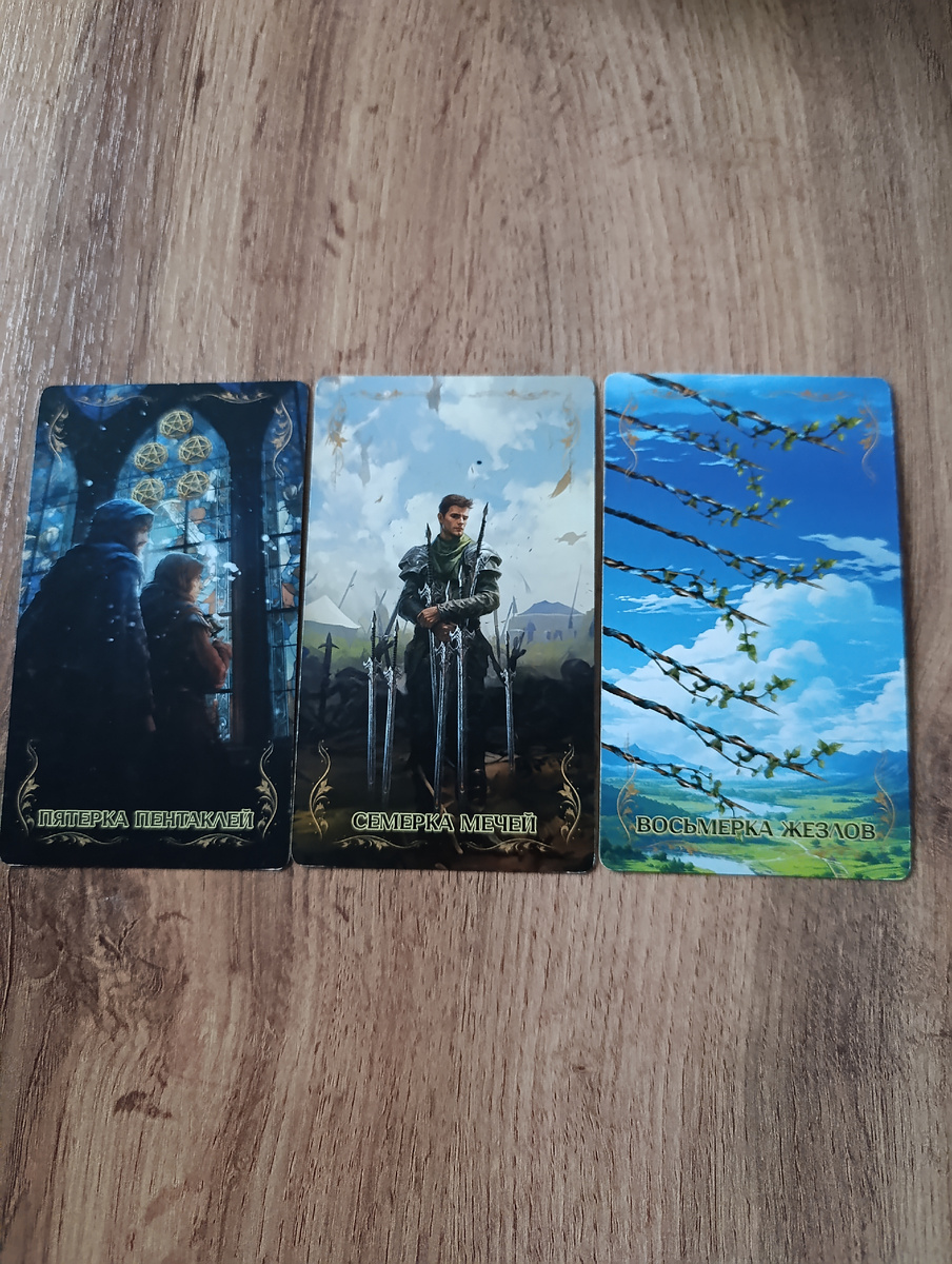 Расклад из трёх карт короткий и информативный. 1. 5 Пентаклей Эта карта указывает на чувство потери, нехватки или одиночества. Загаданный человек, возможно, воспринимает тебя как человека, которому сейчас сложно, кто переживает трудности или изоляцию. Может быть, он видит тебя уязвимым или находящимся в непростой ситуации. 2. 7 Мечей Карта говорит о скрытности, осторожности или даже обмане. Вероятно, этот человек чувствует, что ты что-то скрываешь, или сам он относится к тебе с недоверием. Возможно, он думает, что нельзя доверять полностью, или у него есть подозрения. 3. 8 Жезлов Эта карта связана с быстрыми событиями, коммуникацией и движением вперёд. Загаданный человек думает также о спешке, возможном скором изменении или развитии ситуации между вами. Может, он ждёт какого-то знака, сообщения или быстрого ответа. Итог: В его мыслях сильны чувства тревоги и неопределённости. Он видит тебя с позиции уязвимости и сомнений, возможно, ощущает недосказанность или страх быть обма