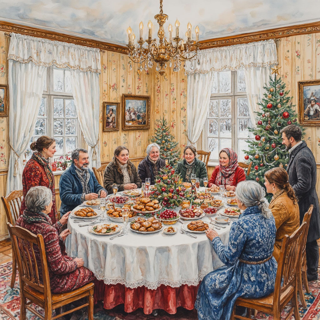 - Праздничный стол по‑прежнему изобилует блюдами, но строгое соблюдение «12 апостолов» уже не обязательно. Кутью готовят не везде, однако мясные угощения, пироги и десерты по‑прежнему занимают центральное место. В некоторых семьях возрождают рецепты старинных рождественских кушаний, экспериментируют с историческими меню.