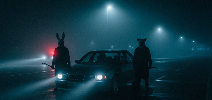 Нет. Преступники просто перекрасили её в чёрный цвет обычной краской для стен и спокойно катались по Калуге. Машину нашли через пару дней на пустыре. Внутри — новогодние маски. Словно насмешка: ждите чего-нибудь поинтереснее.