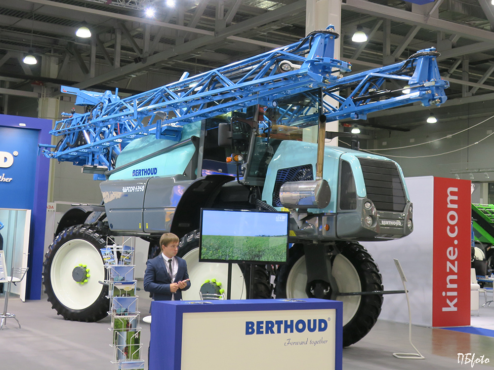Сельскохозяйственная техника. Французский полноприводный опрыскиватель Raptor 4240 компании Berthoud с обоими ведущими и управляемыми мостами, позволяющими двигаться в режиме "крабового хода". Опрыскиватель оснащён пневматическая подвеска мостов с гидравлическими телескопическими амортизаторами. На данном образце применена механическая регулировка ширины колеи, а в дополнительной комплектации эта функция производится с помощью гидравлики. Механическое регулирование колеи возможно в пределах от 1,8 до 2,25 м (в дополнительной комплектации - от 2,2 до 3 м). Дорожный просвет составляет 1,1 м (в дополнительной комплектации может быть увеличен до 1,8 м). Данная установка оснащена 6-цилиндровым двигателем Deutz рабочим объёмом 6,06 л и мощностью 200 л.с. с гидростатическим приводом с мотор-редукторами. Имеется передняя и задняя гидромеханическая блокировка дифференциалов. Также могут устанавливаться двигатели мощностью 217, 244 и 270 л.с. Рабочая скорость в поле обеспечивается на уровне 16-2