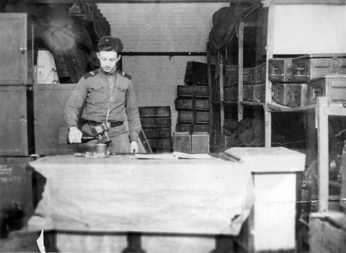 Младший сержант. Каптёр разливает крепкий алкоголь с целью добровольного доведения себя до лёгкой степени алкогольного опьянения на военном складе!