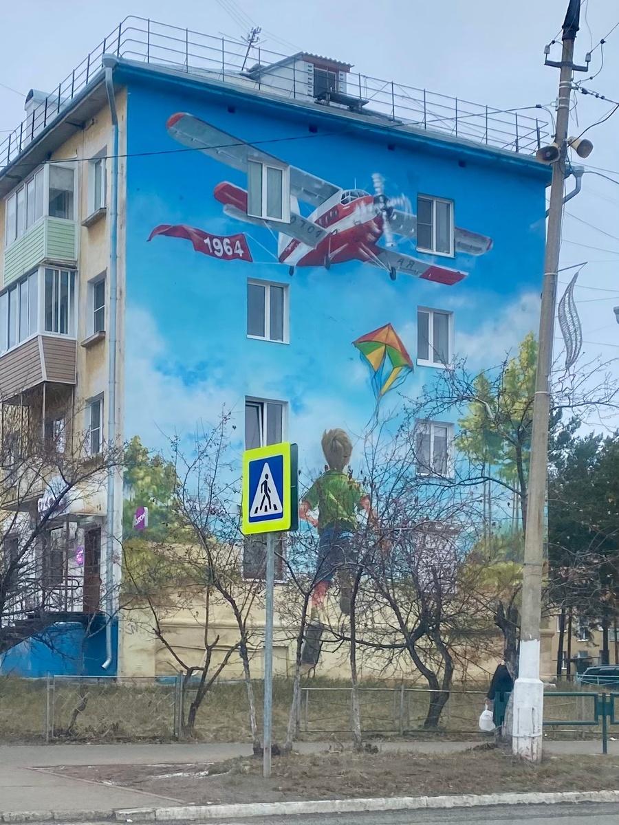 Самолёт на углу Наймушина - Солнечная подлатали. Правда, из-за того, что поверхность под мурал не была отремонтирована должным образом, то самолётик превратится в вечно падающий Бройлер 747 из Крутого пике.