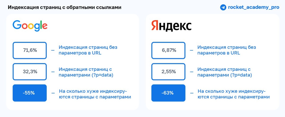 🗑 Параметры в URL у ссылочных доноров Всем SEO-специалистам известно, что страницы с параметрами в URL (вроде fiammeblu.it/profile.php?uid=34386) индексируются хуже, чем обычные, а следовательно и обратные ссылки с них могут не учитываться. Но насколько все реально плохо? Чтобы понять это я проанализировал больше 4к обратных ссылок размещенных на разных схожих по параметрам площадках. Естественно, в эксперимент попали только страницы открытые в robots.txt и без директив вроде noindex. Результаты на изображении. Не стоит сильно надеяться на эффект от ссылок полученных со страниц с параметами в URL (скорее всего он будет в 2-3 раза хуже), а также стоит крепко задуматься прежде чем создавать на собственном сайте посадочные страницы без статических URL ✌️