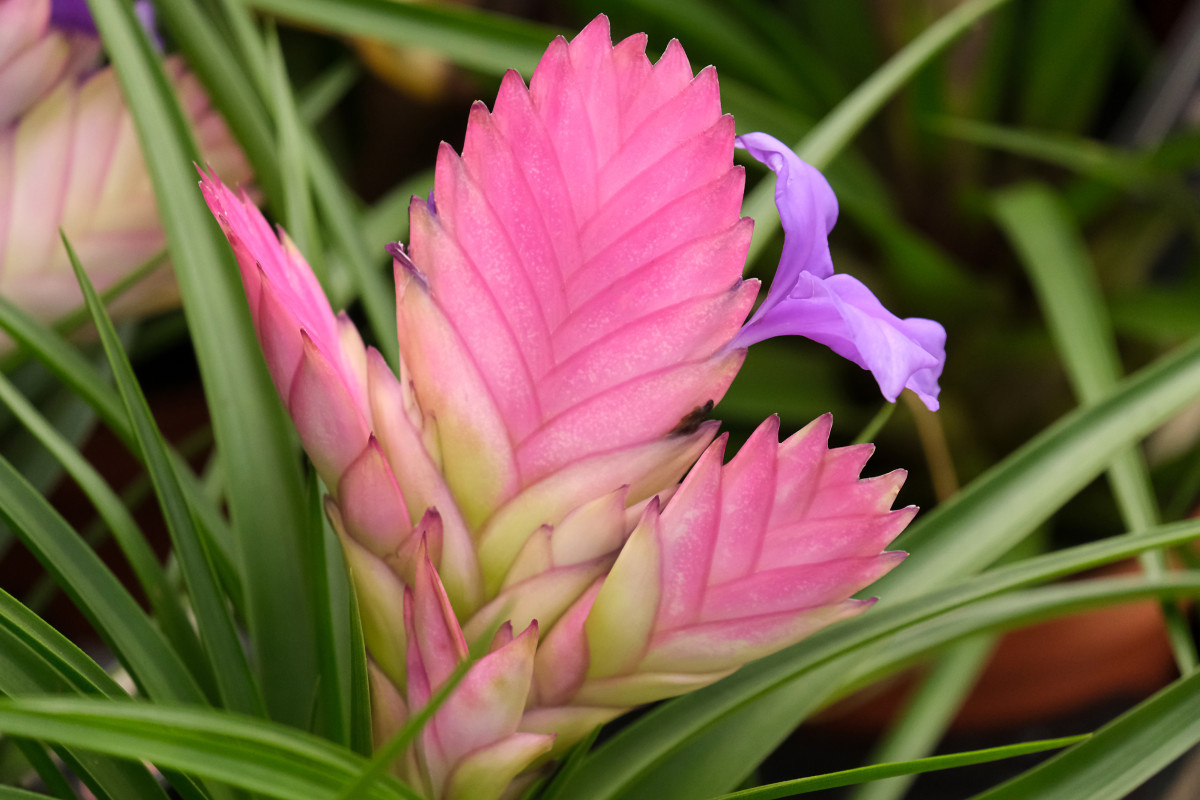 Это вечнозеленый компактный эпифит с тонкими листьями, собранными в розетку. Во время цветения растение выпускает уплощенный ярко-розовый колосок, на котором в течение 2-х месяцев распускаются синие цветы.
