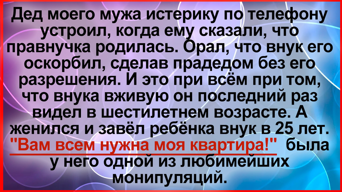 Дед моего мужа истерику по телефону устроил, когда ему сказали, что правнучка родилась. Орал, что внук его оскорбил, сделав прадедом без разрешения. И это при всём при том, что внука вживую он последний раз видел в шестилетнем возрасте. А женился и завёл ребёнка внук в 25 лет.