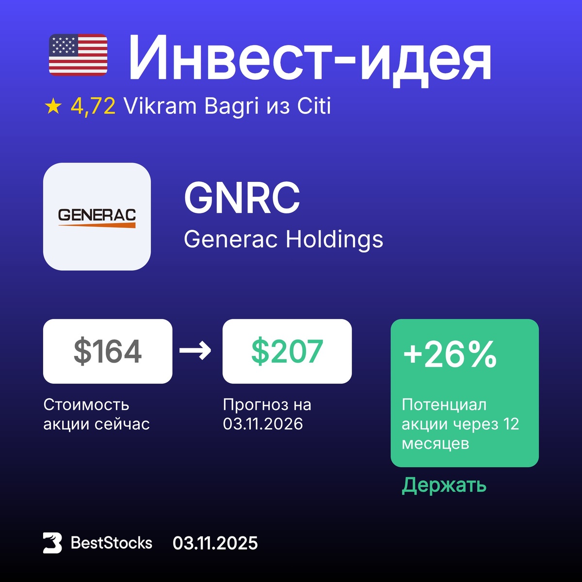 🇺🇸 Инвест-идея по акции Generac Holdings Тикер: GNRC Прогнозная цена: $207 (+26%) Рекомендация: Держать InvestRank акции: 9 из 10 Прогноз сделан: 03.11.2025 Прогноз до: 03.11.2026 Инвест-компания: Citi Аналитик: Vikram Bagri Ещё рекомендации на сегодня → ••••• 📢 Несколько раз в неделю полноценные аналитические обзоры рынка США. Занимательно и просто для понимания даже для новичков.