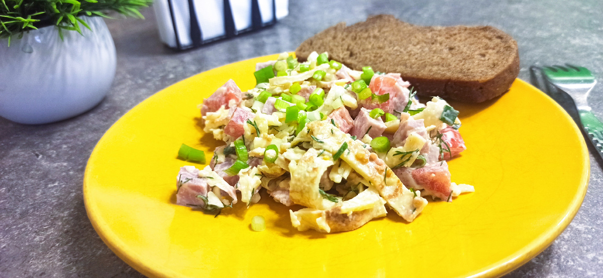 Салат с мясом и яичными блинчиками — пикантный, сочный и нежный