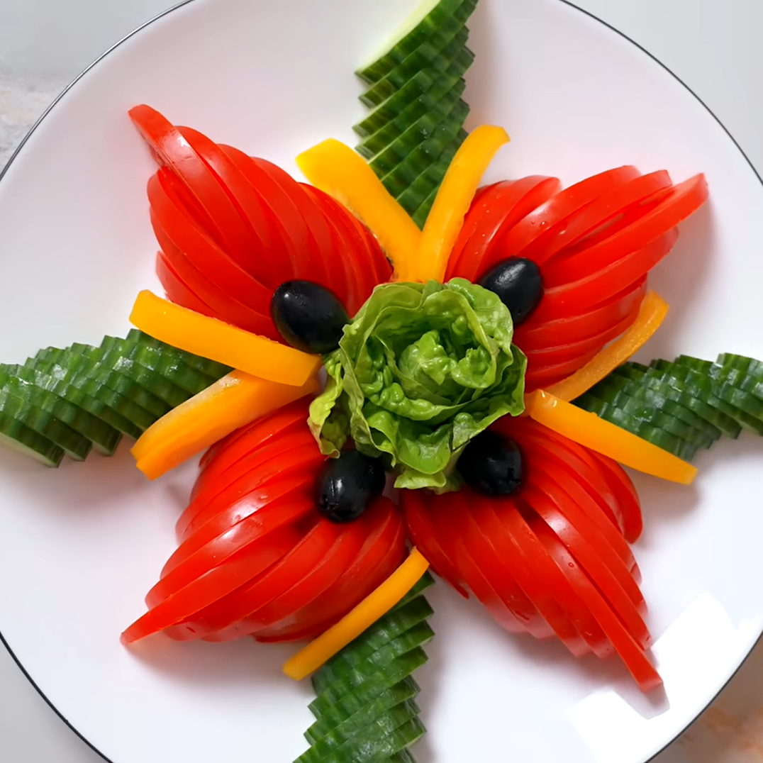 Привет, привет, здравствуйте, мои дорогие подписчики! А теперь сделаем яркую овощную нарезку, которая станет украшением любого стола! Это просто, быстро и всегда работает на ура — свежие овощи исчезают моментально! Сейчас соберём композицию, от которой глаз не оторвать. Ох, как красиво! Ох, как пахнет свежестью! Ингредиенты: Огурцы — 2 шт. Помидоры — 2-3 шт. Болгарский перец (разных цветов) — 2-3 шт. Листья салата (Айсберг, Романо) — несколько крупных листьев Маслины или оливки — для украшения Лимон — несколько тонких долек Свежая зелень (петрушка, укроп) — небольшой пучок Оливковое масло, соль, специи — для подачи Как собираем — творим красоту! Подготовим основу: Возьмите большое плоское блюдо. Выложите на него чистые и сухие листья салата — это будет наша «зелёная подушка». Создаём структуру: Огурцы нарежьте тонкими кружочками или длинными слайсами. Помидоры — красивыми дольками или кружочками. Болгарский перец очистите от семян и нарежьте соломкой или кольцами. Формируем композицию