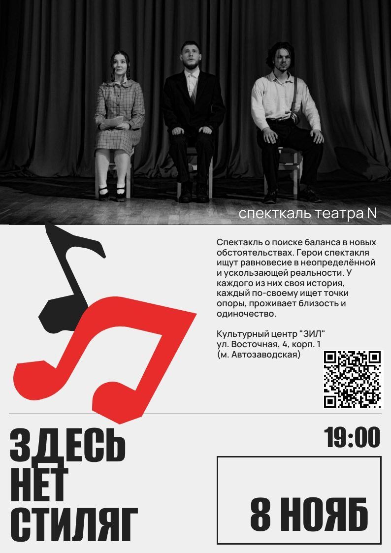 СПЕКТАКЛЬ ТЕАТРА N «Здесь нет стиляг» — история о балансе в новых обстоятельствах, творческой свободе, силе и слабости по пьесе молодого драматурга А. Кислого. Герои спектакля ищут равновесие в неопределенной и ускользающей реальности. У каждого из них своя история, каждый по-своему ищет точки опоры, проживает близость и одиночество. 🗓 8 ноября ⏰️19:00 📍КЦ «ЗИЛ», ул. Восточная 4к1, м.Автозаводская 🎟 БИЛЕТЫ https://iframeab-pre8338.intickets.ru/event/67649634