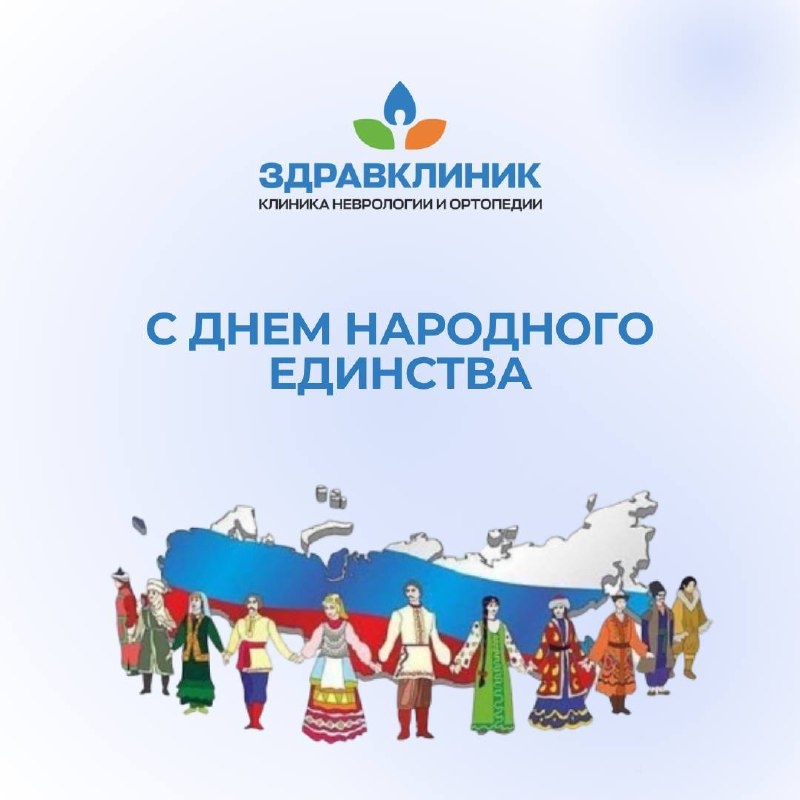 Поздравляем с Днём народного единства! 🇷🇺 Сегодня мы отмечаем важный день в истории нашей страны — день, который напоминает о силе единства и общих ценностях, которые связывают нас. В этот день хочется пожелать каждому из вас здоровья, гармонии и уверенности в будущем. Пусть наши общие усилия, внимание друг к другу и забота о своем здоровье делают нас сильнее и сплоченнее. В клиниках «ЗдравКлиник» мы помогаем вам в лечении и восстановлении здоровья, чтобы вы могли вернуться к активной и полноценной жизни. Благодарим за доверие и за то, что выбираете нас на пути к вашему здоровью и благополучию! Забота о себе — это важный шаг на пути к общей гармонии. Пусть каждый день будет наполнен позитивом и силой единства! С Днём народного единства!