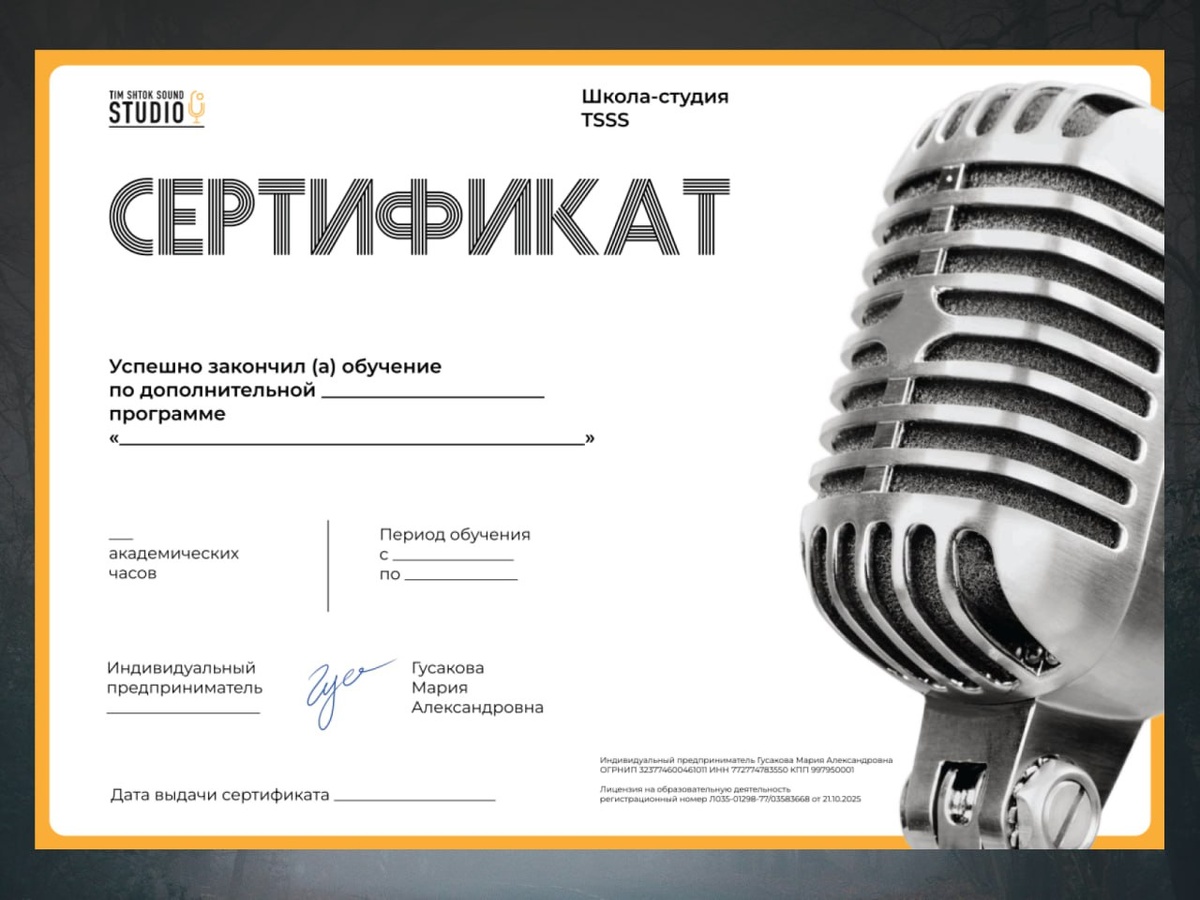 Теперь по окончании курса «Профессиональная запись голоса и аудиопродакшен» вы получите официальный сертификат о прохождении курса, который будет служить подтверждением вашей квалификации.