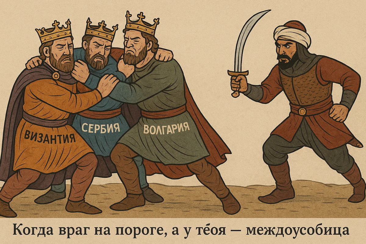 В XIV веке Балканский полуостров был в полном беспорядке: Все эти страны были ослаблены бесконечными междоусобными войнами. Они были как лёгкая добыча, ожидающая хищника. Этим хищником стали турки-османы. Это было воинственное тюркское племя, которое в конце XIII века создало своё государство в Малой Азии (территория современной Турции) во главе с князем Османом. Сначала византийцы сами звали их в Европу как наёмников в своих гражданских войнах. Османы приехали, осмотрелись, и им понравилось. 😅 Они быстро переправились через проливы и начали захватывать земли уже для себя. Они даже перенесли свою столицу в Европу — в город Адрианополь. Бедная Византия превратилась в "огрызок" вокруг Константинополя и была вынуждена платить дань султану. Следующей на очереди была Сербия. В 1389 году на Косовом поле произошла решающая битва. Вскоре турки захватили и ослабевшую Болгарию. Балканы почти на 500 лет попали под власть Османской империи. От некогда великой Византии остался один лишь Константин