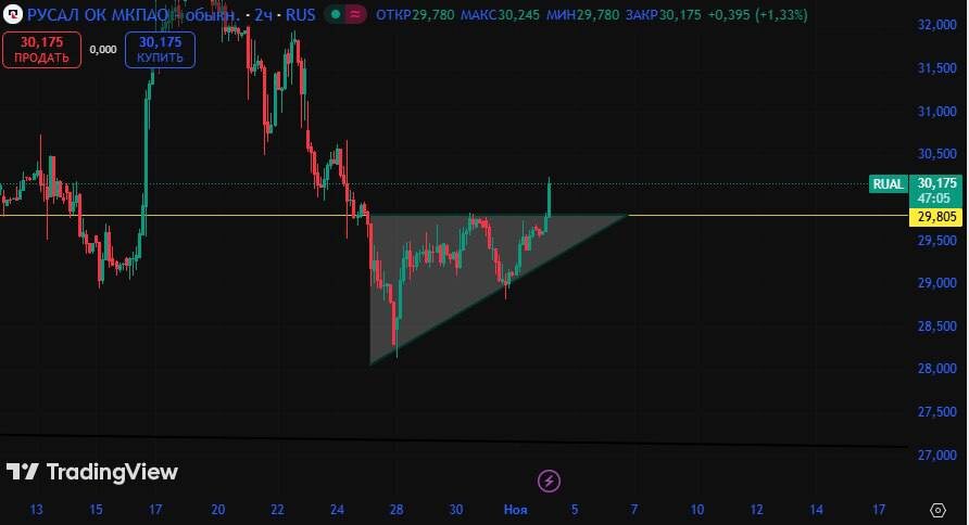 #RUAL #РУСАЛ 🔼Стенка клина 33.8, как пробьет подтвердит фигуру! Отработка до 47,35. Пока что фигура не подтверждена. Сопротивление 32.630, как пробьет пойдет выше. Цена актива пробила верхнюю стенку треугольника, тем самым подтвердив фигуру. Отработку треугольника ожидаю до 30,660 р. Ищем твх в Лонг, следим за уровнями! Не является индивидуальной инвестиционной рекомендацией. Канал в телеграм Квартира на Таити