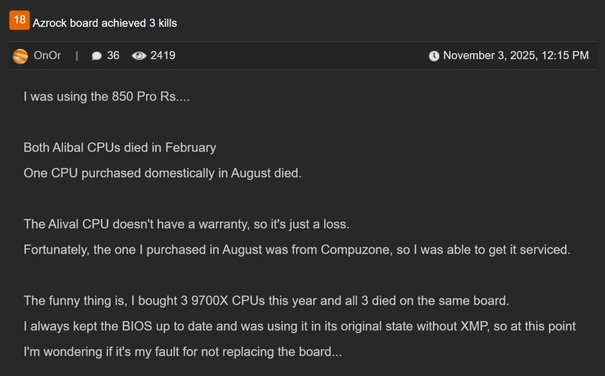 В сообществе ПК-бояр разгорается скандал вокруг материнских плат ASRock для платформы AM5. Один из пользователей в Южной Корее сообщил о вопиющем случае: его материнская плата ASRock B850 Pro RS последовательно вывела из строя три процессора AMD Ryzen 7 9700X. Пострадавший пользователь рассказал на форуме QuasarZone, что первые два процессора, купленные на AliExpress, перестали работать. Подумав, что проблема в неофициальных чипах, он приобрел третий 9700X у официального дистрибьютора. Однако и этот процессор "погиб" после установки в ту же плату. Примечательно, что после первых двух инцидентов пользователь отправлял плату в сервисный центр ASRock. Компания вернула ее, заявив, что плата полностью исправна, а виной всему, вероятно, были "бракованные процессоры с AliExpress". Пользователь утверждает, что не занимался разгоном, не использовал даже профили EXPO и своевременно обновлял BIOS. Этот случай дополнил растущее число жалоб на материнские платы ASRock AM5, которые, по сообщениям, с