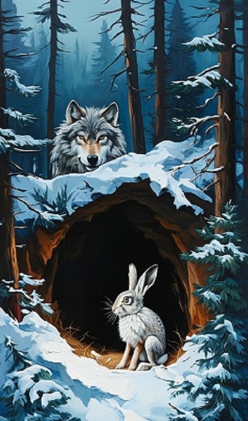 Свищет ветер за окном, Темнота ползёт с небес. Снежным беленьким ковром Принакрыло хвойный лес. Под сугробом чья-то норка, Ухо длинное торчит. Сне́га навалило горкой, Зайца зуб от холода стучит. К белой шубке не привык, Лапы мёрзнут, хвост в снегу. Слышно где-то птичий крик, Окружила вьюга гордую тайгу. Оттолкнулся лапой и прыжок! Захрустел под зайцем мягкий снег. Шорох за кустом ушастого отвлёк, «Затаиться или выбрать шустрый бег?» Пахнет хищником и злобой, За кустом сверкнул оскал. Подсказал бы зайцу кто-бы, Чтоб быстрей в нору скакал. Капает слюна у волка, Заурчало в волчьем животе. И тайга мгновенно смолкла, Замерла́ картина на холсте. Волчья лапа красный снег мешает, Капли крови омывают белый мех. Хищник пищу по закону Бога добывает, А законы Божьи действуют для всех. © Светлана Чарушина✨ #слово #автор #музыка #песни #стихи #литература #душа #Бог #новое #личное #творчество #хобби #эзотерика #магия #аркан #матрица #нумерология #вселенная #волшебство #заговор #рифма #ритм #лирика #р