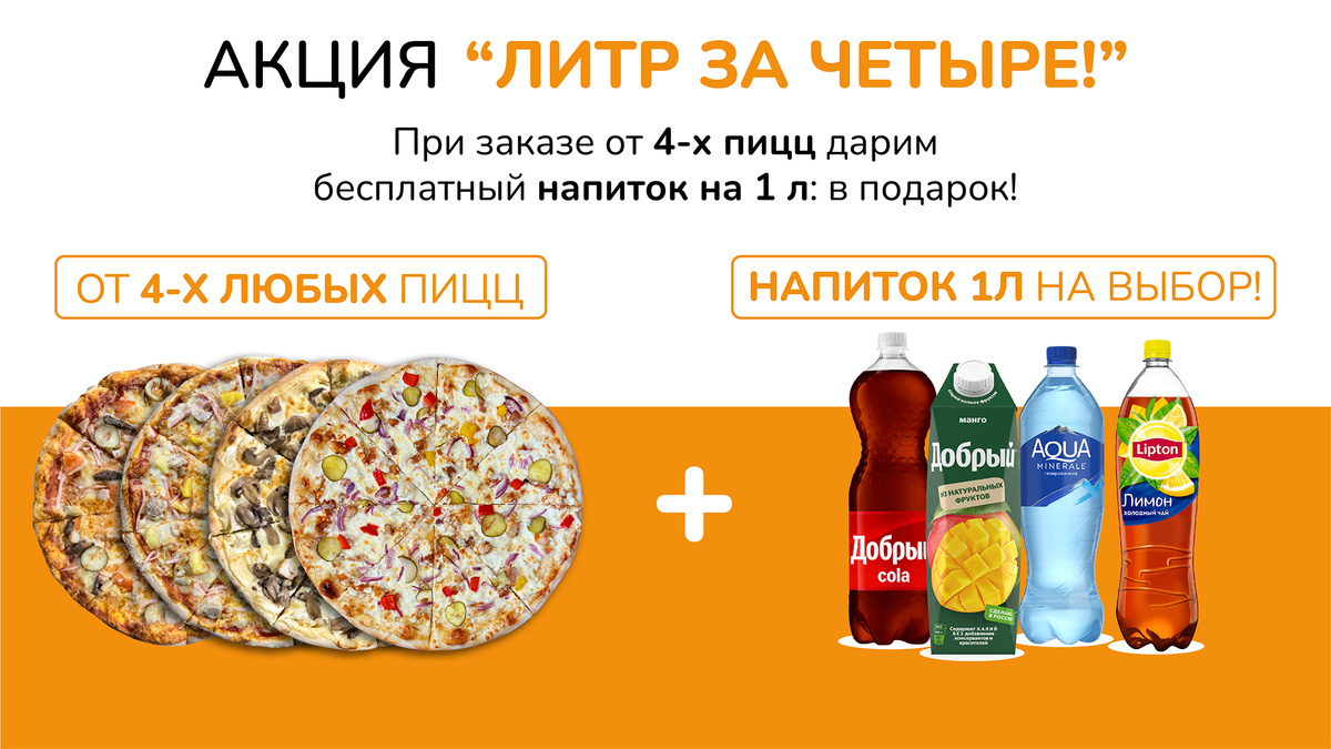 Если Вы планируете застолье, и Вам требуется более 4 пицц, просто знайте: в “Мон БатонЪ” за покупку 4х пицц и более — ЛИТР в подарок!