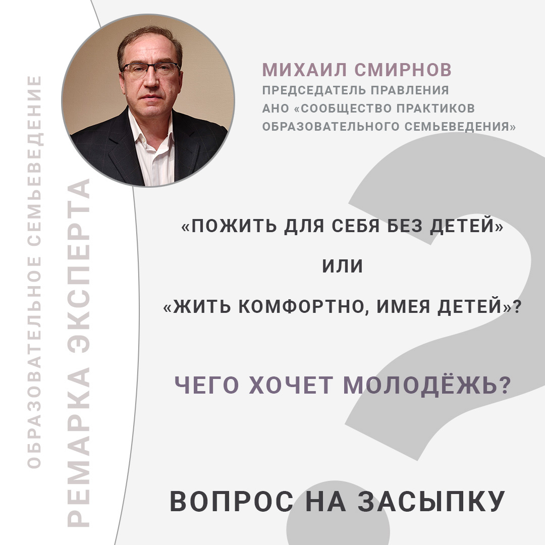 Как правильно понимать запрос молодёжи на рождение детей? И что на него ответить? Очень часто люди постарше в вопросе рождения детей гребут всю молодёжь под одну гребёнку: мол, не хотят рожать, хотят пожить для себя. Однако это «пожить для себя» у современной молодёжи имеет две вариации: «пожить для себя без детей» и «жить комфортно, имея детей». И это совершенно разные мировоззренческие, репродуктивные и демографические установки. Первая основана на убеждении, что дети — это вообще зло, которое только мешает человеку жить и наслаждаться даром Божиим — жизнью. И поэтому «в моей жизни они не нужны, я против этого зла». Вторая предполагает желание жить в браке и иметь в нём ребёнка или несколько детей, но при условии, что сохранится предшествующий уровень потребления и появится возможность достойно обеспечивать ребёнка. То есть такая установка предполагает, что дети — желанны, но возможны только в случае не просто сохранения предыдущего ресурсного уровня супружеской пары, но при его рост