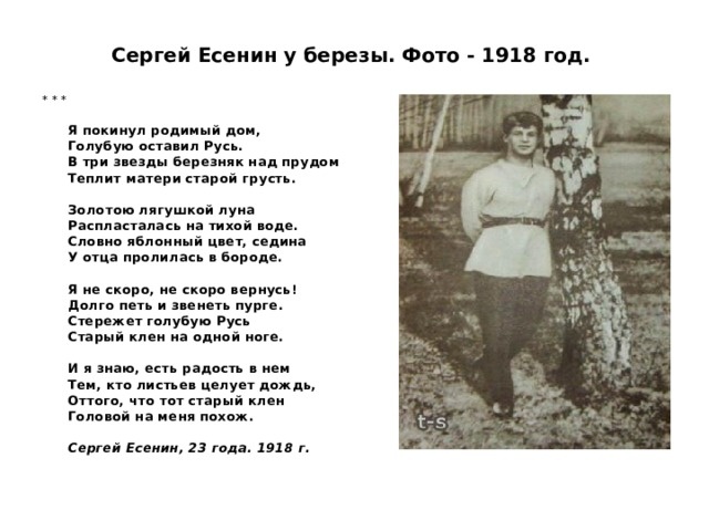 Песня по ссылке на Рутуб Сергей Есенин Я покинул родимый дом, Голубую оставил Русь. В три звезды березняк над прудом Теплит матери старой грусть. Золотою лягушкой луна Распласталась на тихой воде. Словно яблонный цвет, седина У отца пролилась в бороде. Я не скоро, не скоро вернусь! Долго петь и звенеть пурге. Стережет голубую Русь Старый клен на одной ноге. И я знаю, есть радость в нем Тем, кто листьев целует дождь, Оттого что тот старый клен Головой на меня похож. [1918]