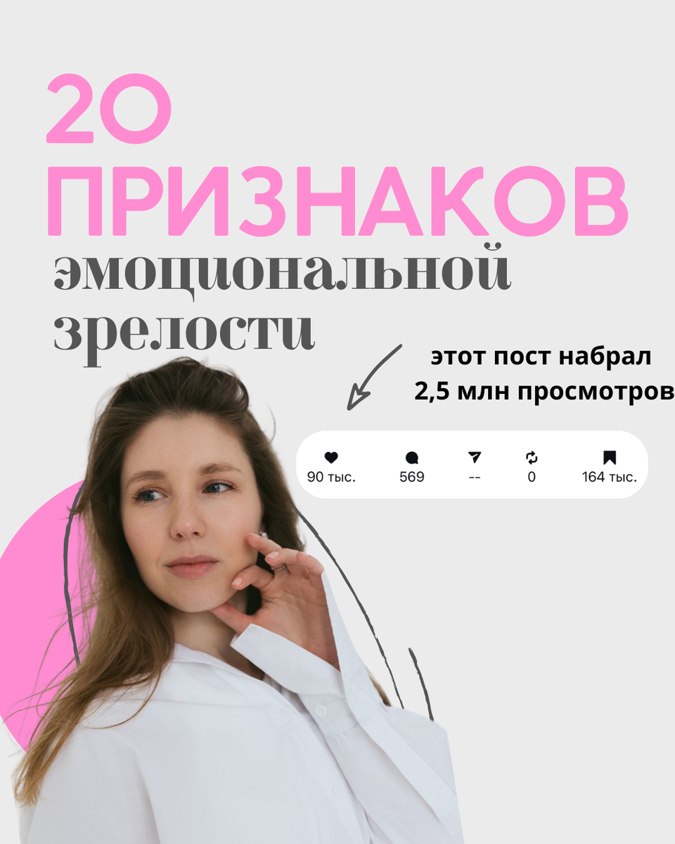 Эмоциональная зрелость — это глубокое и полное погружение в реальность, которое зарождается в раннем детстве и долго обретает форму — не без помощи учителей, не без дыр и заплаток. Это рискованный путь сквозь травмы и боль. Я читала Эриксона, Роджерса, Маслоу, Нэнси Мак-Вильямс, Олпорта, Ошо, Линдси К. Гибсон, слушала своих психологов, делала выводы из жизненного опыта и, если честно, всё равно до конца не понимаю, где граница нормы и патологии. Потому что понятие психологического здоровья условно. Но ориентиры есть. Если вы понимаете, что пока не дошли до внутренней зрелости — не беда. Человек должен пройти множество естественных фаз на своём пути. Не страшно их проходить, страшно — застрять. Не страшно откатываться в сложных ситуациях, страшно — не просить помощи. Психолог — это своего рода катализатор для зрелости. 20 признаков эмоциональной зрелости: 1. Вы умеете и желаете говорить о своих чувствах открыто, прямо, «как есть», выбирая при этом экологичную форму для вас и собесе