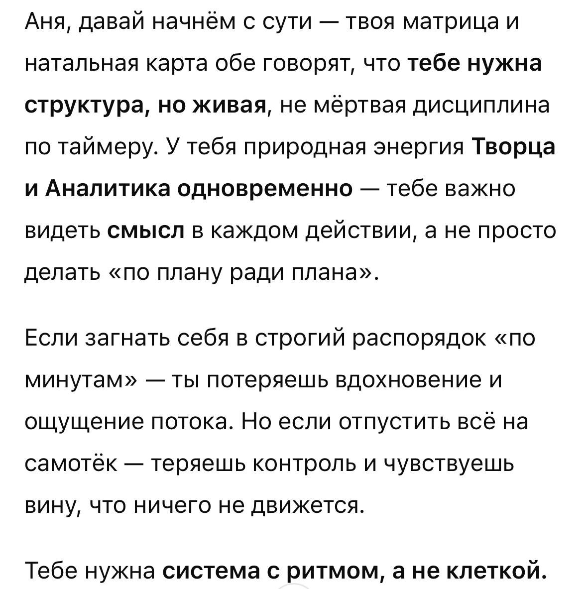 Как ChatGPT заменил мне психотерапевта и бизнес-коуча метафорически, конечно, но результатами я довольна 😅 Я использую чат гпт не ради текстов, а как инструмент стратегического мышления. Раз в неделю мы с ним прорабатываем разные аспекты моей жизни: ▪️мы уже выстроили систему выплаты всех долгов с конкретными сроками и суммами ▪️разобрали структуру запуска моих продуктов, с чего начать и куда двигаться А сегодня мы разбирались с тем, как наладить структуру и выстроить систему в жизни, ибо хаос меня накрывает🫣 И вот к чему пришли: Оптимальный тип структуры для меня - модульно-цикличная система. Это не жесткий график, а система модулей, которая повторяется по циклам (день, неделя, месяц) Принцип: Есть фиксированные опоры (модули), но наполнение их меняется по вдохновению Основная концепция: ритм недели - моя структура. Каждый день имеет свою функцию, а внутри неё пространство для выбора Не планировать каждую минуту, а жить по модульному циклу: в каждом дне свои модули (утро /