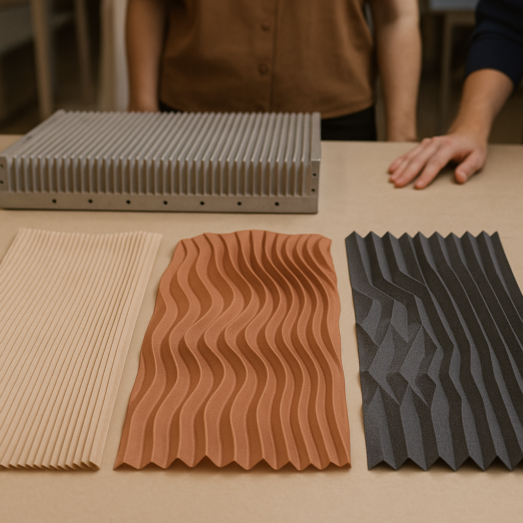 Перед запуском партии изготавливается образец, чтобы заказчик мог оценить, как выбранная плиссировка ложится на конкретный материал — ведь разная ткань по-разному держит складку и по-своему отражает свет.