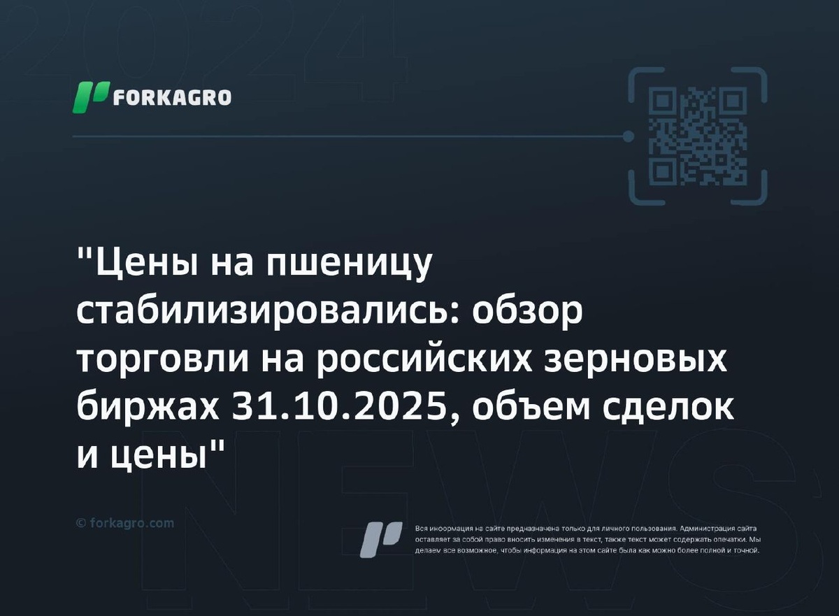 "Цены на пшеницу стабилизировались: обзор торговли на российских зерновых биржах 31.10.2025, объем сделок и цены