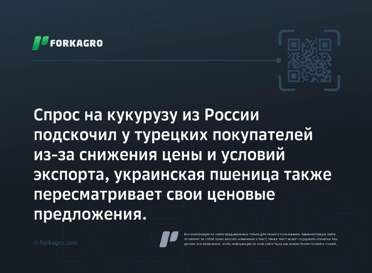 Спрос на кукурузу из России подскочил у турецких покупателей из-за снижения цены и условий экспорта, украинская пшеница также пересматривает свои ценовые предложения. Спрос на российскую кукурузу увеличился среди турецких покупателей из-за снижения цены до $285 за тонну, вызванного уменьшением пошлины на экспорт. Молдавская кукуруза дороже из-за требований к сертификатам. Украинская кукуруза дороже молдавской. Цена украинской пшеницы снизилась до $300 за тонну, а Турция закупила пшеницу по более низкой цене. Перейти к источнику