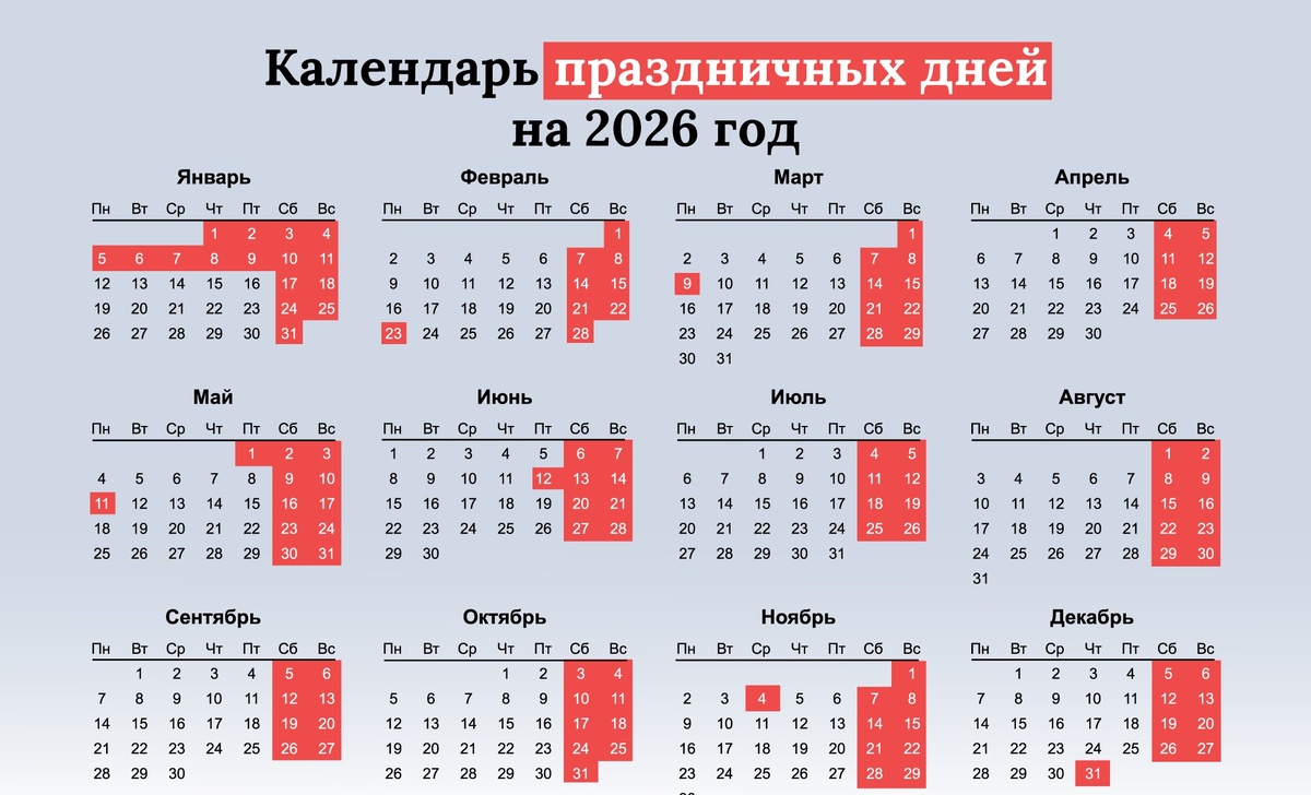 Планируете отпуск, важные дела или просто хотите знать, когда будут длинные выходные? Разберём официальный производственный календарь на 2026 год с точными датами праздников, переносами и количеством рабочих дней. В 2026 году отмечаем: В 2026 году действуют следующие переносы (по постановлению Правительства РФ): Как это работает: В 2026 году сокращённые на 1 час рабочие дни: Примечание: другие предпраздничные дни (22 февраля, 7 марта, 30 апреля, 8 мая, 11 июня, 3 ноября) в 2026 году выпадают на выходные, поэтому сокращения не будет. Чтобы максимизировать дни отдыха, обратите внимание на эти периоды: Актуальные данные всегда можно найти: Итог: