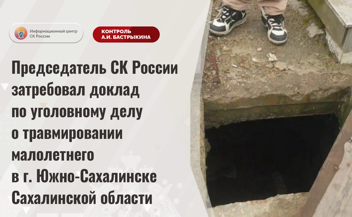 Председатель СК России затребовал доклад по уголовному делу о травмировании малолетнего в г. Южно-Сахалинске Сахалинской области В сети Интернет сообщается, что в октябре текущего года во время прогулки на улице Московской в городе Южно-Сахалинске Сахалинской области девятилетний мальчик упал в неогороженный канализационный люк. В результате пострадавший получил травму ноги. В СУ СК России по Сахалинской области возбуждено уголовное дело. Председатель Следственного комитета Российской Федерации Александр Иванович Бастрыкин затребовал у руководителя СУ СК России по Сахалинской области Бэликто Балдоржиевича Базарова доклад о предварительных и окончательных результатах расследования уголовного дела. Исполнение поручения поставлено на контроль в центральном аппарате ведомства. #СледственныйКомитет #СКРоссии #СКР #ИЦСКР #ИнформационныйЦентр #АлександрБастрыкин #ПредседательСКР #КонтрольПредседателяСКР #КомментарийКонтроль #СахалинскаяОбласть