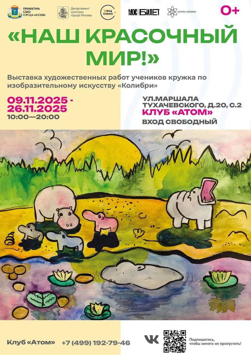🎨 Выставка «Наш красочный мир» 📍 Клуб «Атом», ул. Маршала Тухачевского, д.20, стр.2 (СЗАО, Хорошёво-Мнёвники) 📅 9–26 ноября 2025 🕙 10:00 — 20:00 💫 Вход свободный | 0+ Клуб «Атом» приглашает всех на выставку художественных работ кружка изобразительного искусства «Колибри» — место, где детское воображение превращается в живую палитру чувств, линий и историй. На выставке — акварель, цветные карандаши и гуашь. Здесь прозрачность акварели встречается с мягкостью штриха, а насыщенная гуашь придаёт образам смелость и объём. Каждый рисунок — это взгляд ребёнка на мир: природу, семью, мечты и радость повседневности. ✨ Приходите, чтобы увидеть мир глазами юных художников, вдохновиться и улыбнуться! 📞 +7 (499) 192-79-46 #Москва #СЗАО #ХорошёвоМнёвники #КлубАтом #Колибри #НашКрасочныйМир #Выставка #ДетскоеТворчество #Искусство #Культура #КудаПойти #Бесплатно #окцсзао 📱 Подписывайся на наш канал, чтобы не пропустить интересные мероприятия и мастер-классы в СЗАО!