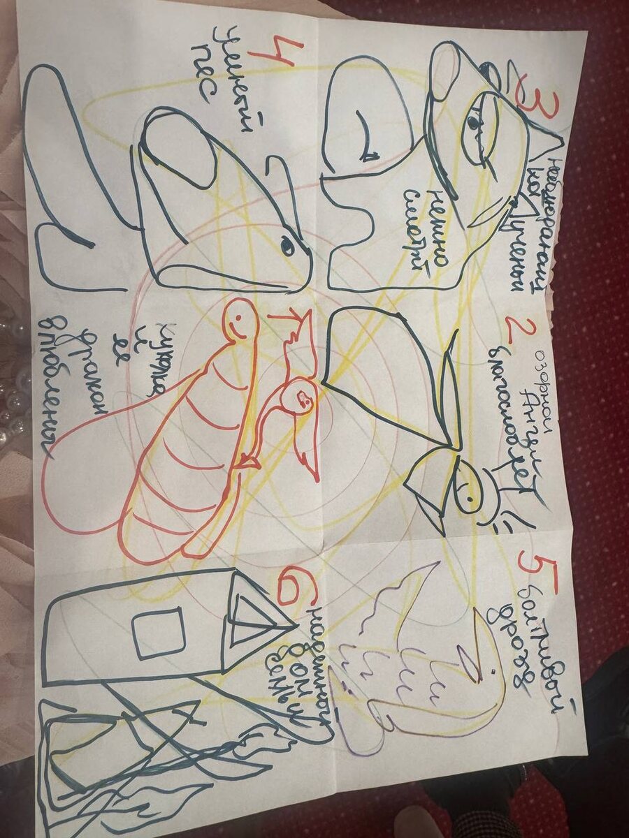 Мастер-класс С начала рисуем каракули Потом складываем лист таким образом чтоб получилось 6 квадратов Все квадраты нумеруем После дорисовываем фигуры у каждого квадрата Потом называем каждый квадрат Это маршрутные под сказочные карточки