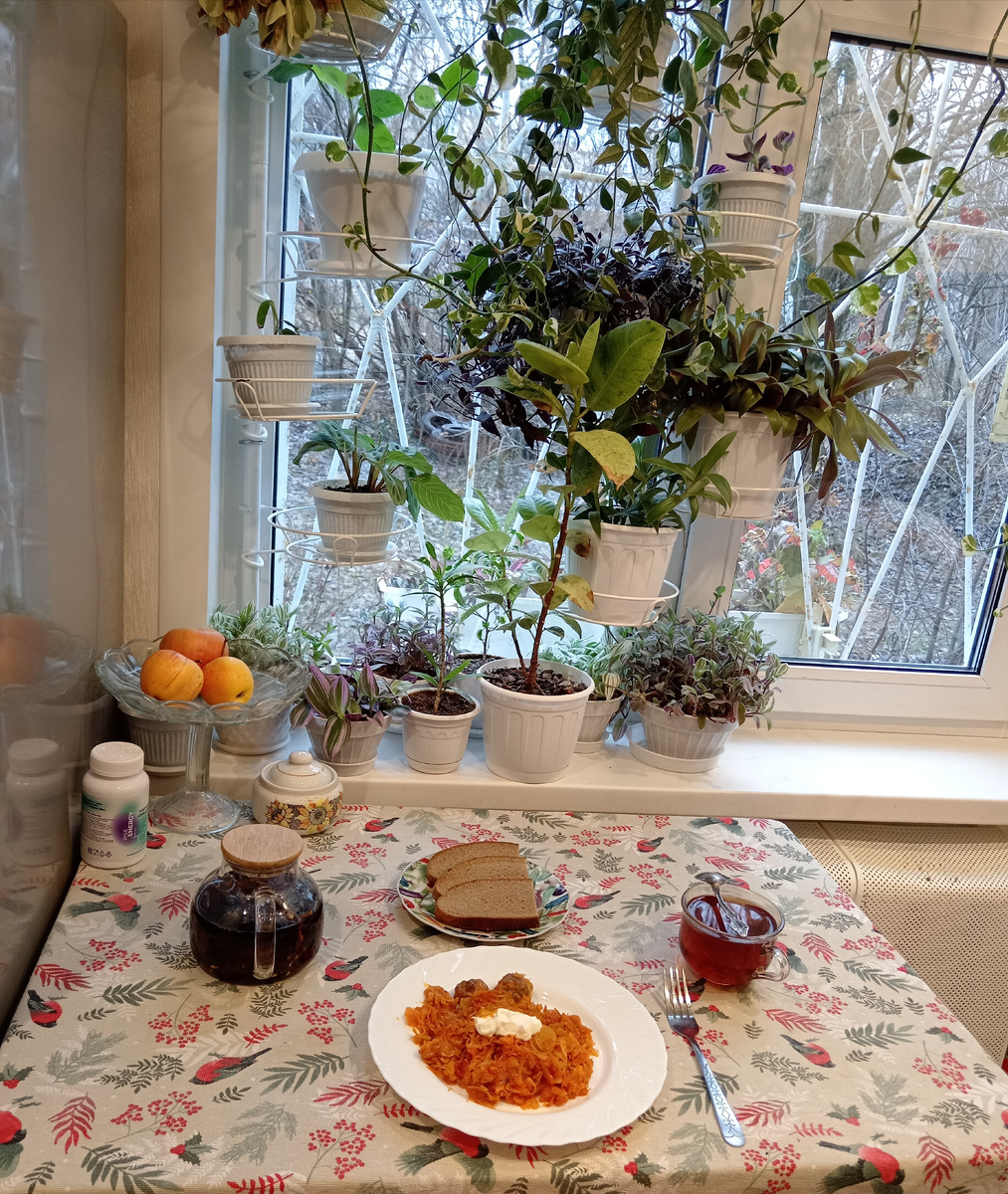 Вчера пораньше спать легла. Так ночью мне так спокойно было. Ничего не слышно было. Даже ветра в тополях не слыхала. Так глубоко в объятиях Морфея редко бываю. А причина тому, что если поздно ложусь, то долго уснуть не получается. 9:05. Ну и на что я надеялась... Муське в миску сухого кошачьего корма положила. Рядом воду поставила. Нет причин меня с утра беспокоить бедной голодной кошке. Но серая в прыжке передними лапами уцепилась за ручку двери и прошла в комнату. Шла гневно мяукая. Посмотрела я миску. Ещё корм есть. Тактильный контакт серой мышке потребовался Мяуканьем требовала: "Вы всё спите, а Мусенька с вечера не глаженная, не обласканная!!!" Пригрела, приласкала. Корм из пакетика вытряхнула. Серый ушастый фенек есть отказался. -12 С температура воздуха на улице. Пока чайник умиротворённо пофыркивал как ёжик, сходила на улицу за смородиновыми веточками. Куртку конечно же накинула. Куда же без куртки в такую холодину. На завтрак разогрела себе тушёную квашеную капусту с фрикадель