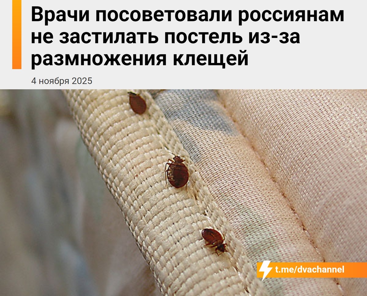 ❗️Заправлять постель сразу после сна вредно для здоровья, предупреждают врачи Во время сна тело выделяет пот, и постель становится тёплой и влажной — в таких условиях активно размножаются пылевые клещи и бактерии, которые питаются частичками кожи. Их количество может вырасти в 5-10 раз, а это повышает риск аллергии, дерматита и даже астмы. Медики советуют не спешить заправлять кровать: лучше откинуть одеяло, открыть окно и оставить постель проветриваться хотя бы на час, чтобы она просохла и остыла. Да я вообще не заправляю. Какой я молодец. Источник: t.me/dvachannel