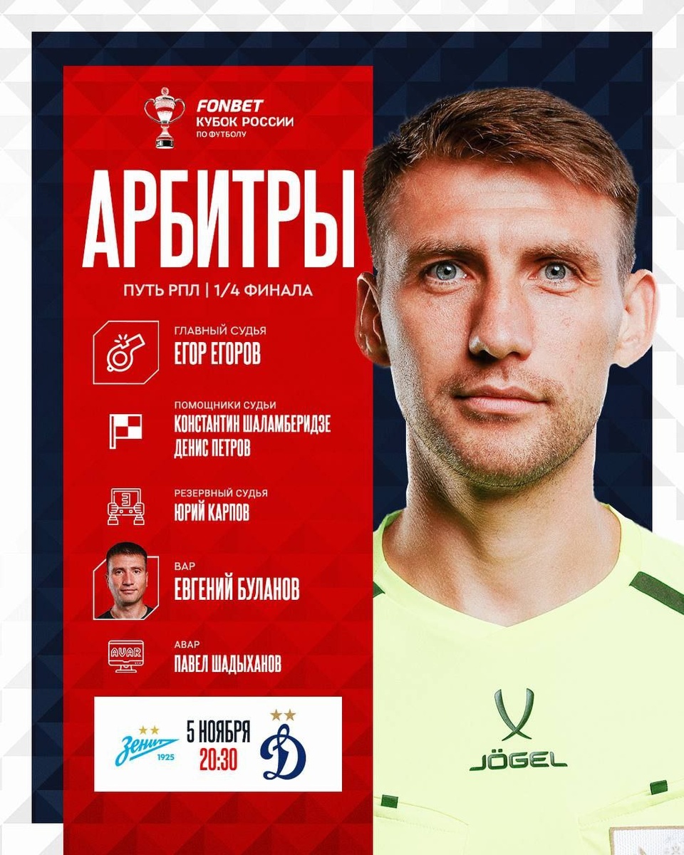 Егор Егоров назначен главным арбитром первого матча 1/4 финала Пути РПЛ Кубка России #зенитДинамо