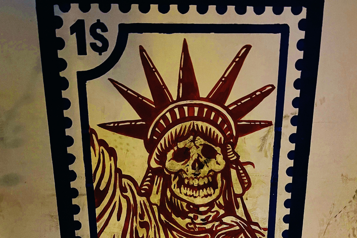 На стенах бывшего посольства есть целая серия стрит-арта в виде марок. Они будто коллекция из альтернативного альбома, где каждый рисунок - не про путешествия, а про критику американского образа жизни. На одной марке — упаковка картофеля фри с буквой «М», явно напоминающая логотип «Макдональдса», как символ того, что под глянцевой и аппетитной оболочкой американского фастфуда скрывается нечто совсем иное — насилие, ограничения и даже страдания… Это моя версия ассоциаций, возможно у Вас другая.