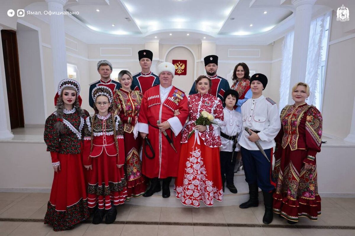 Семья из Лабытнанги отметила жемчужную свадьбу по казачьим традициям 🎉 Гости мероприятия собрались в ЗАГСе в национальных костюмах. Встречали юбиляров караваем. Своим выступлением праздник украсил казачий ансамбль. Евгений и Елена Кошелевы вместе 30 лет. На Ямале супруги живут с 2000 года. Глава семьи — ветеран МВД на пенсии, работает в частном охранном предприятии. Елена 15 лет посвятила культуре. У юбиляров двое сыновей и дочь, которая подарила родителям внучку. Поздравляем юбиляров и желаем здоровья и счастья! 🐻❄️ ЯМАЛ. Официально | Подписаться