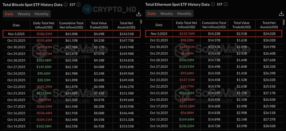 Bitcoin ΠΈ Ethereum ETF (SV) Π§ΠΈΡΡΡΠΉ ΠΎΡΡΠΎΠΊ Π·Π° Π²ΡΠ΅ΡΠ°ΡΠ½ΠΈΠΉ Π΄Π΅Π½Ρ: βͺ#BTC = -$186,510,000. βͺ#ETH = -$135,760,000. Crypto Headlines