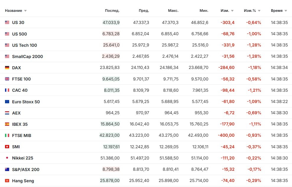 Хорошо, что сегодня на нашем рынке нет торгов. Все зарубежные индексе в ауте. В сырье тоже всё в красной зоне: Газ -0,7% Нефть -1,16% Серебро -0,75% Золото -0,22% Биткойн -1,82%