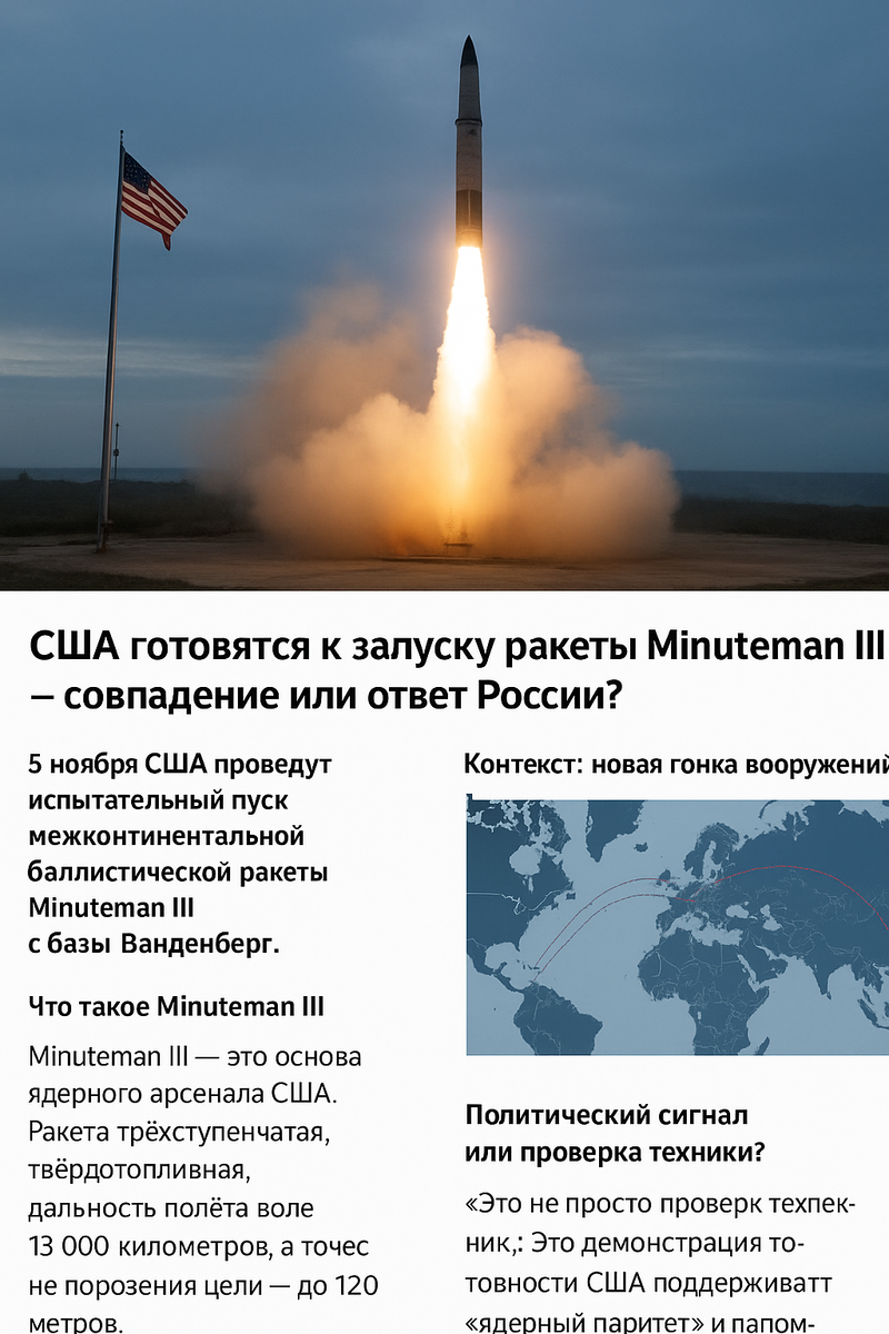 США готовятся к запуску ракеты Minuteman III — совпадение или ответ России? Любые испытания стратегических систем, даже «невооружённые», внимательно отслеживаются всеми ядерными державами.
