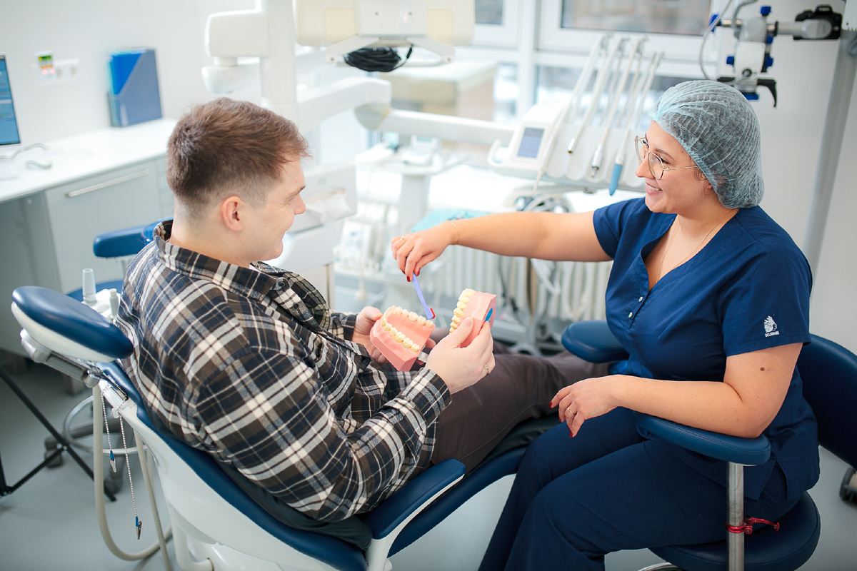 - Индивидуальную мотивацию пациента: Обучение правильной домашней гигиене с помощью ирригатора, зубных щеток, флоссов и ершиков.