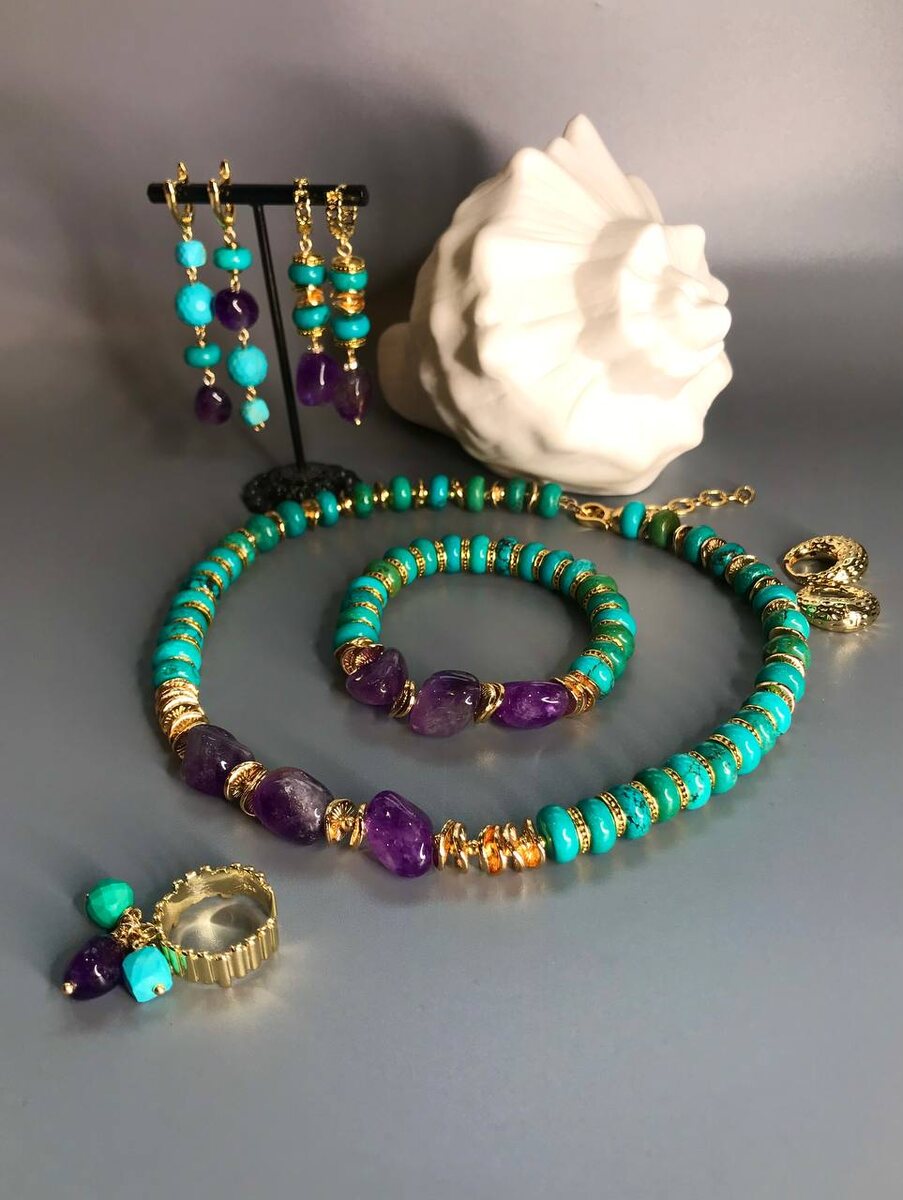 Яркие и крупные камни в украшениях очень востребованы . Последний комплект с аметистами, бирюзой и турквенитом получился ярким, сочным и солнечным. Целых 3 пары сережек к колье и браслету, одно кольцо- все можно комбинировать и менять. Цена комплекта очень праздничная, ведь скоро Новый год!