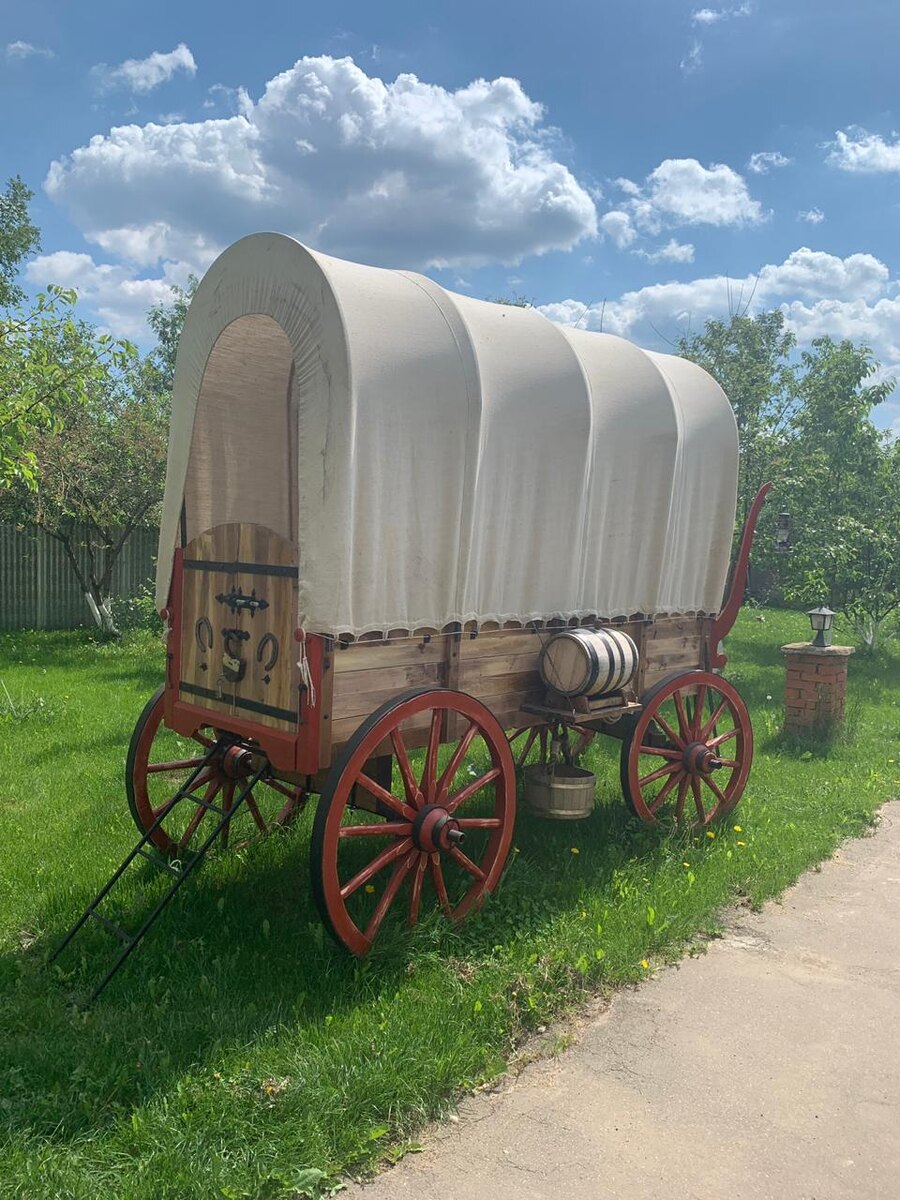 На изображении представлена повозка, которая является традиционным транспортным средством, используемым в различных культурах для перевозки грузов и людей. Повозка имеет деревянный каркас и покрыта тканью, что позволяет защитить содержимое от непогоды. Колеса повозки окрашены в красный цвет, что придает ей яркий и заметный вид.Повозки такого типа часто использовались в прошлом для перевозки товаров, сельскохозяйственных продуктов и даже для путешествий на дальние расстояния. Они могли быть запряжены лошадьми или другими животными, что позволяло им передвигаться по дорогам и полям.В современном мире повозки такого типа могут использоваться в исторических реконструкциях, на фестивалях или в туристических целях, чтобы продемонстрировать традиции и культуру прошлых веков. Наша мастерская специализируется на изготовлении старинных повозок, важно учитывать ряд факторов, чтобы продукт получился качественным и аутентичным.