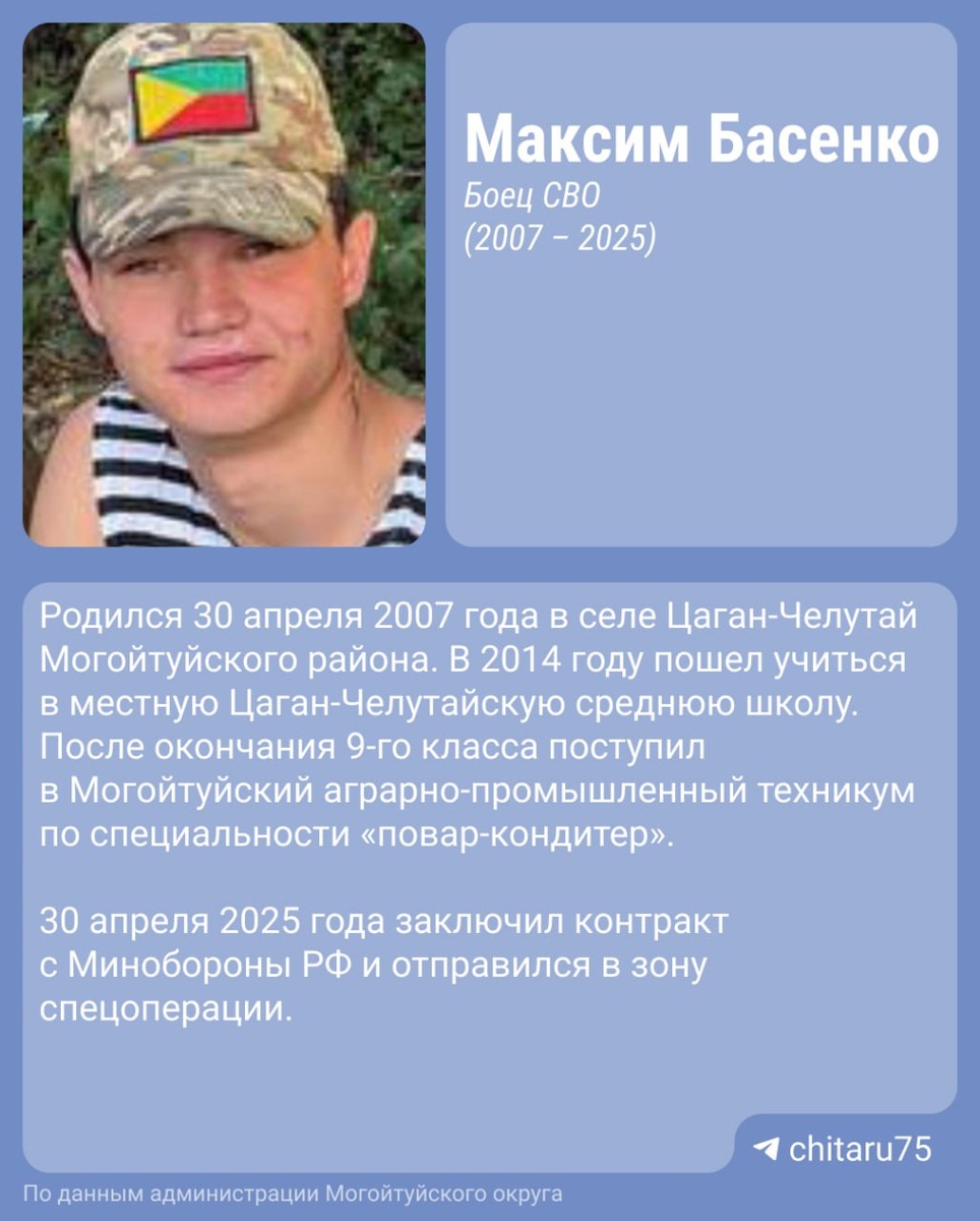 18-летний забайкалец погиб на СВО. В тг-канале администрации Могойтуйского округа рассказали, что парень подписал контракт в день своего 18-летия, он участвовал в боях за населенный пункт Темировка в ДНР, там он погиб 28 сентября, проявив мужество и самоотверженность: Светлая память о защитнике Родины, с честью и мужеством выполнившем свой воинский и гражданский долг, навсегда останется в наших сердцах. 🟦Подписаться на «Чита.Ру» в МАХ