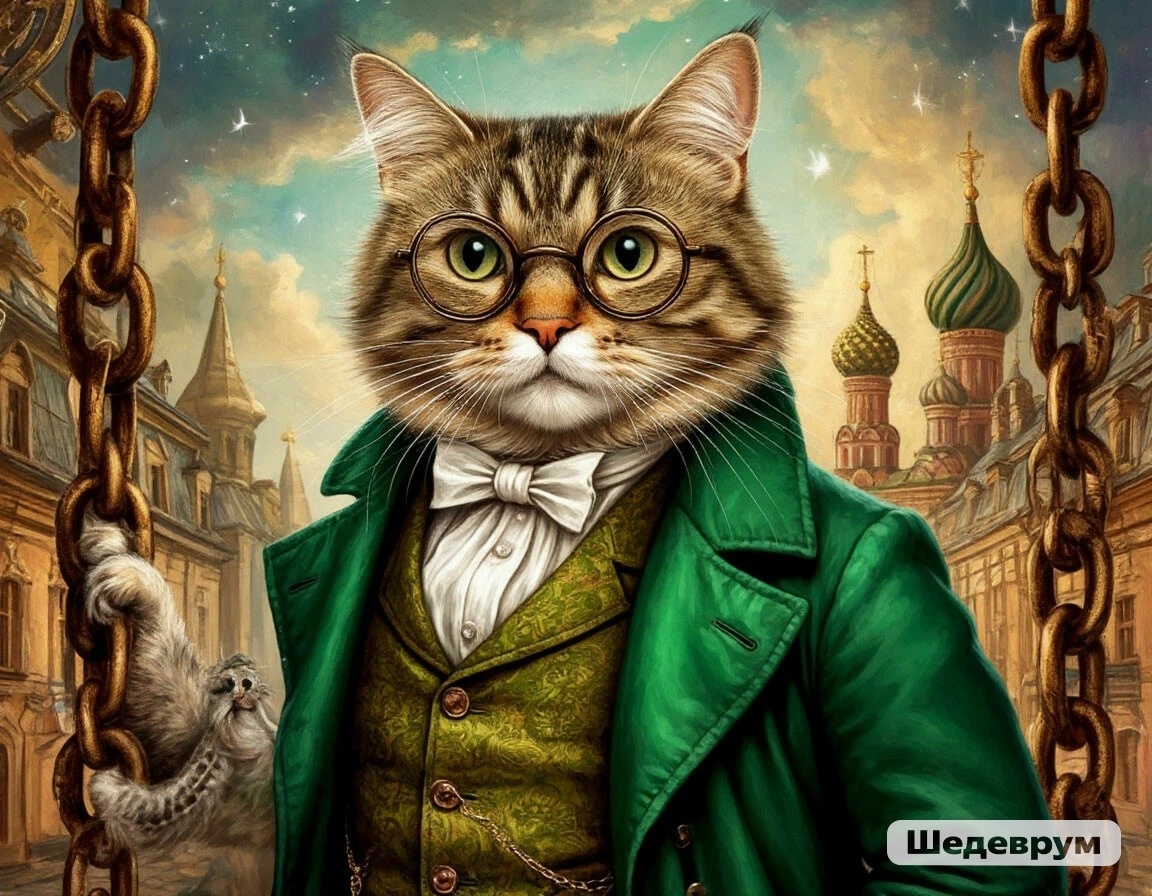 Образ мудрого всезнающего кота запечатлён и в литературной классике. Александр Сергеевич Пушкин подарил миру учёного кота, который ходит по цепи кругом, рассказывает сказки и поёт песни.