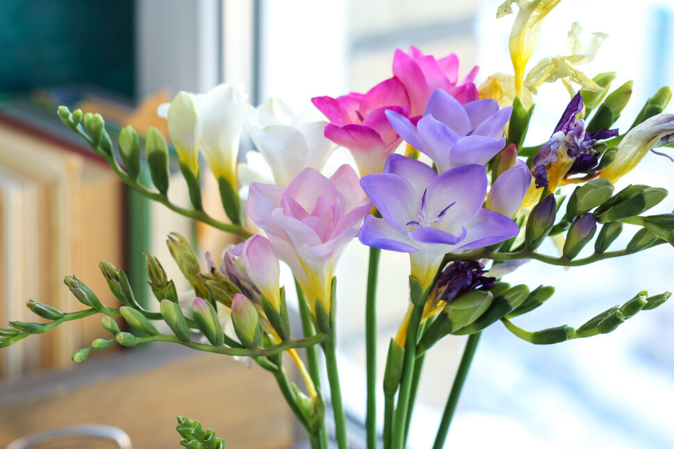 Фрезия − южноафриканская прелестница, которая очаровывает с первого взгляда своей нежностью и грациозностью. Генетически она близка к знакомым нам ирисам и гладиолусам. Что за растение такое и для чего его можно выращивать? Раскроем все, что знаем сами! Листья фрезии мягкие, направлены вниз, а цветоносы, напротив, очень вытянуты и стремятся вверх. Листья будто расступаются перед нежными цветками. Кстати, палитра цветов фрезии очень разнообразна: от белого до сиреневого, включая переходные оттенки. Гибриды фрезии, известные сегодня домашним садоводам, появились немногим более 100 лет назад. По сравнению с дикими предками, эти сорта еще более красивы: цветоносы пышнее и крепче, цветы крупнее, расцветки интереснее. Как и гладиолусы, фрезии размножаются клубнелуковицами, только они очень маленькие − от 1 до 2,5 сантиметров. Клубни сажают в середине апреля в прохладную почву − земле нужно всего 8-10℃ тепла. Желательно, чтобы еще полтора месяца температура в области корней и не поднималась в